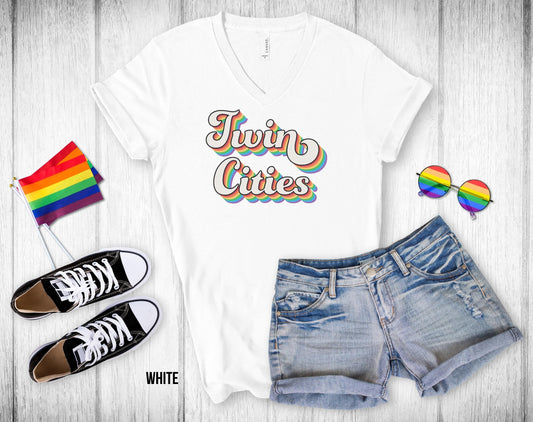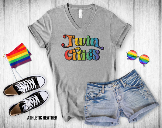 Twin Cities Rainbow Gradient Text - Unisex V-Neck Tee